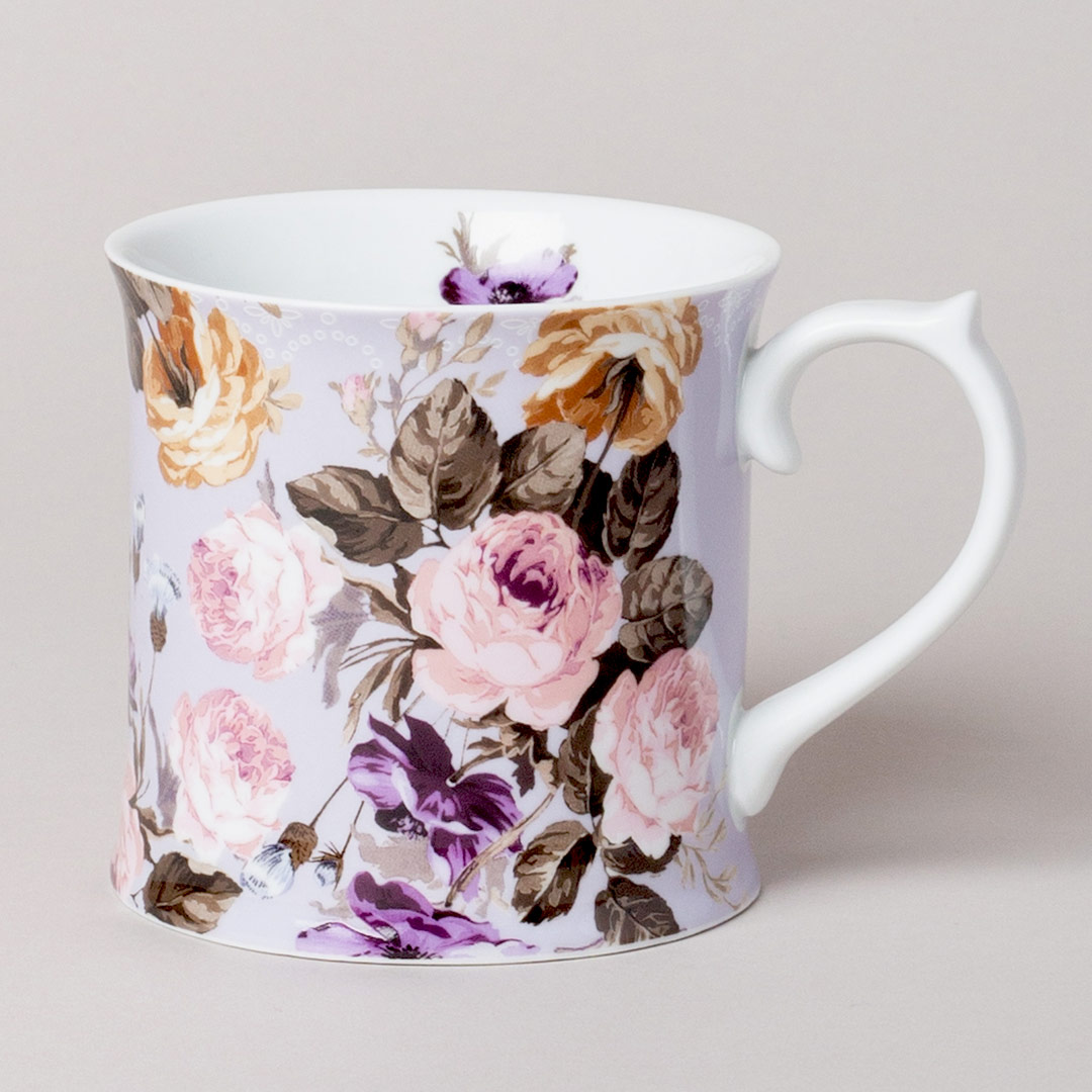 This lovely super-white porcelain mug in the best-selling tankard shape from Katie Alice is decorated in pretty vintage florals from the Wild Apricity collection. Big old-English style roses along with anemones, thistles and rusted foliage sit on a pretty lilac tinted background with lace detail round the rim.